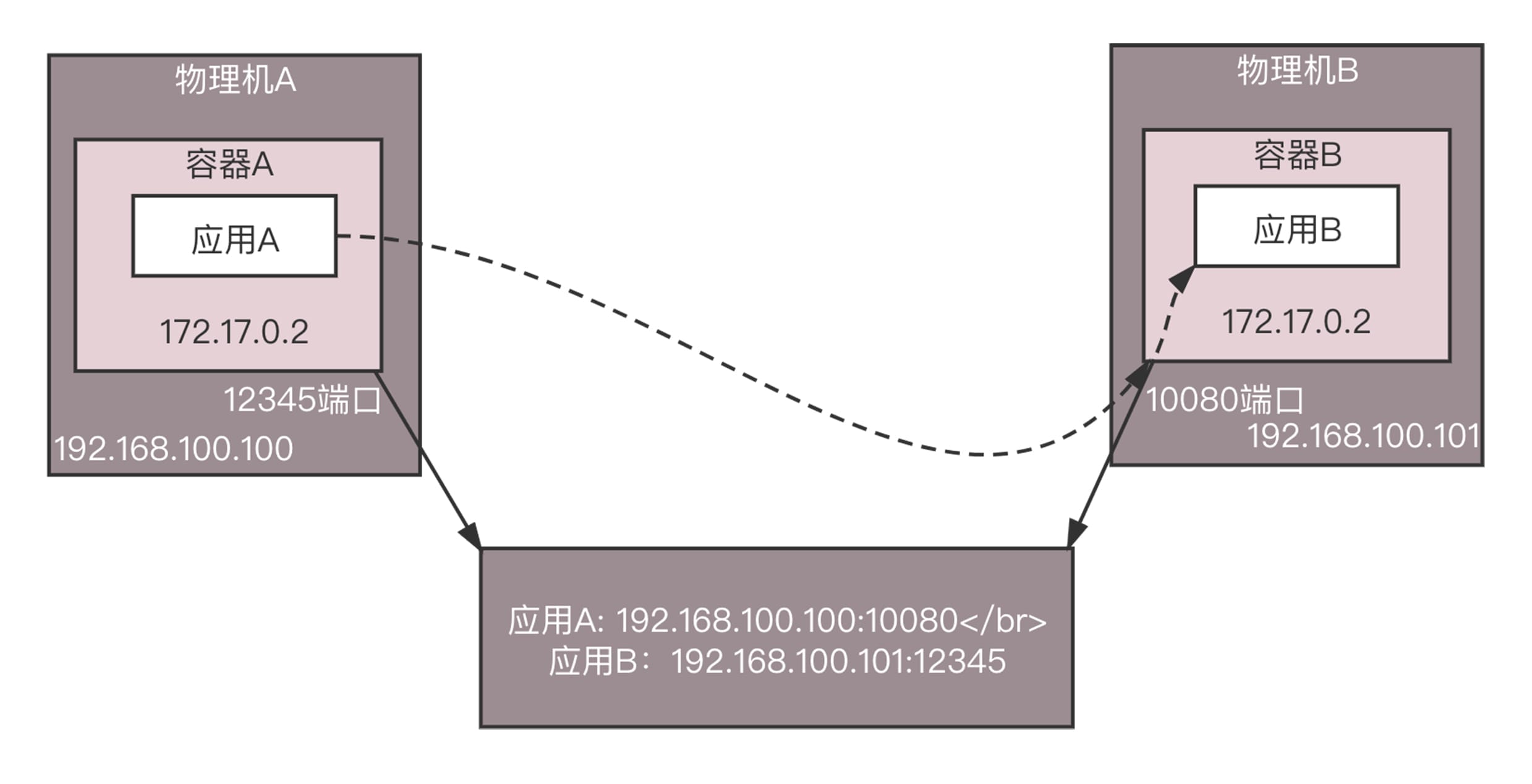 这样存在的问题是,应用是在容器里面的,它怎么知道物理机上的IP地址和端口呢?这明明是运维人员配置的,除非应用配合,读取容器平台的接口获得这个IP和端口。一方面,大部分分布式框架都是容器诞生之前就有了,它们不会适配这种场景;另一方面,让容器内的应用意识到容器外的环境,本来就是非常不好的设计。