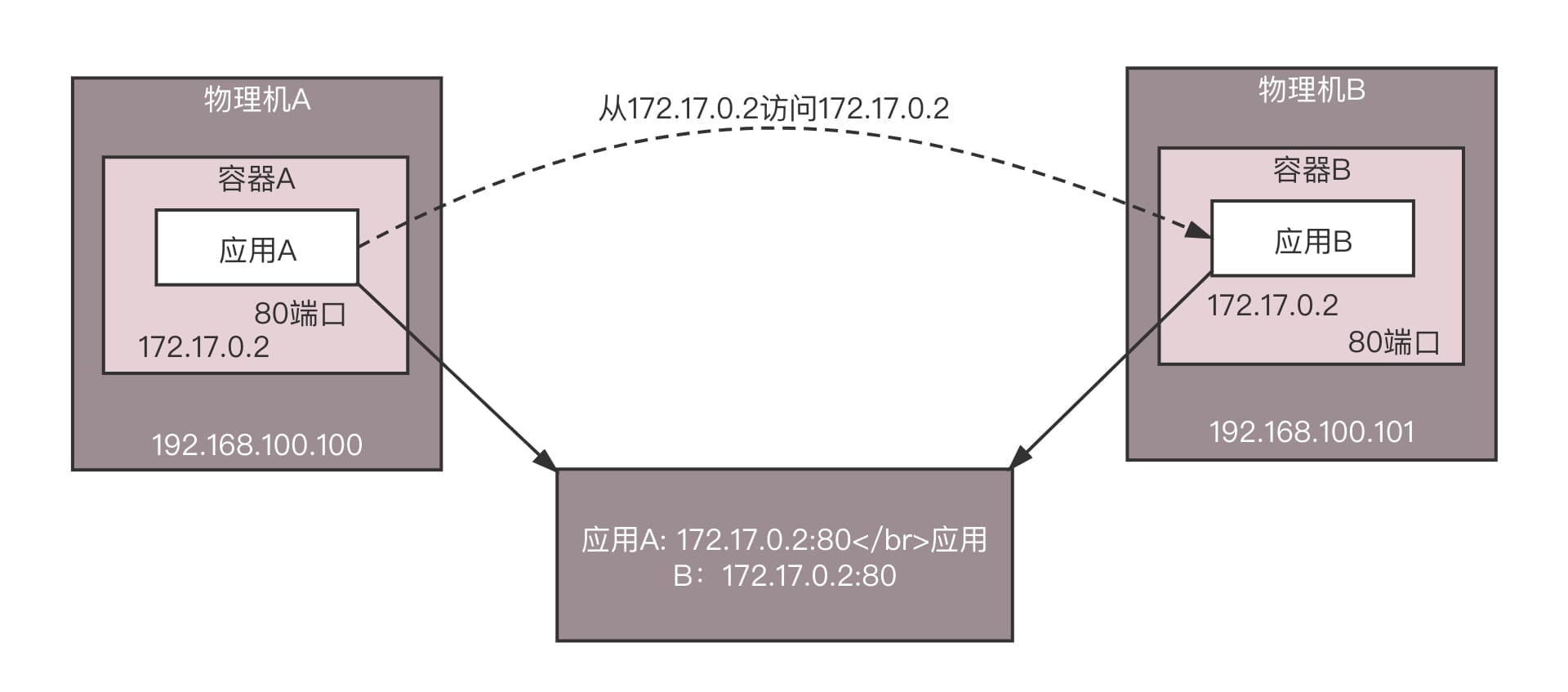 接下来是如何相互通信的问题。NAT这种模式,在多个主机的场景下,是存在很大问题的。在物理机A上的应用A看到的IP地址是容器A的,是172.17.0.2,在物理机B上的应用B看到的IP地址是容器B的,不巧也是172.17.0.2,当它们都注册到注册中心的时候,注册中心就是这个图里这样子。
