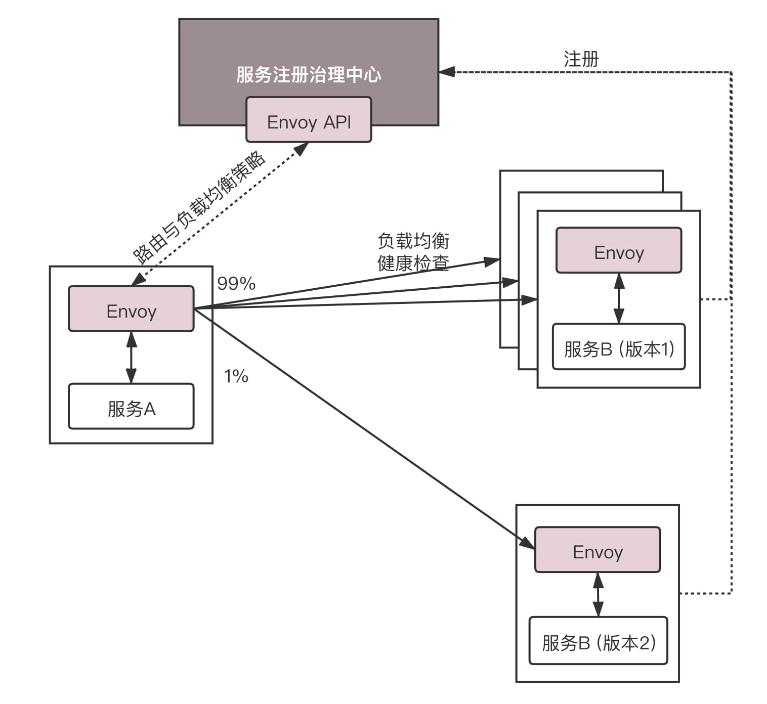 一种常见的规则是配置路由策略。例如后端的服务有两个版本,可以通过配置Envoy的route,来设置两个版本之间,也即两个cluster之间的route规则,一个占99%的流量,一个占1%的流量。