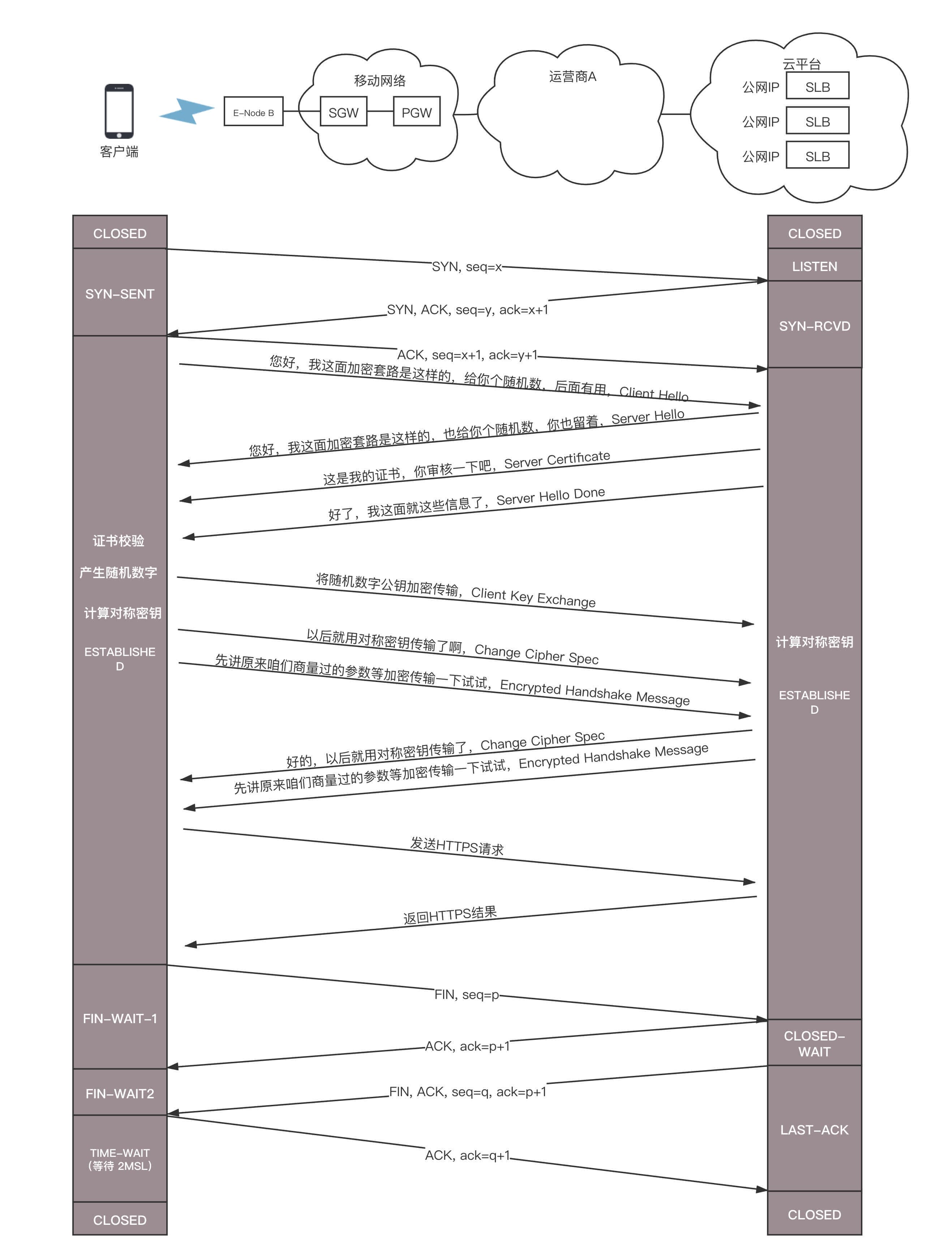 HTTPS协议是基于TCP协议的,因而要先建立TCP的连接。在这个例子中,TCP的连接是在手机上的App和负载均衡器SLB之间的。