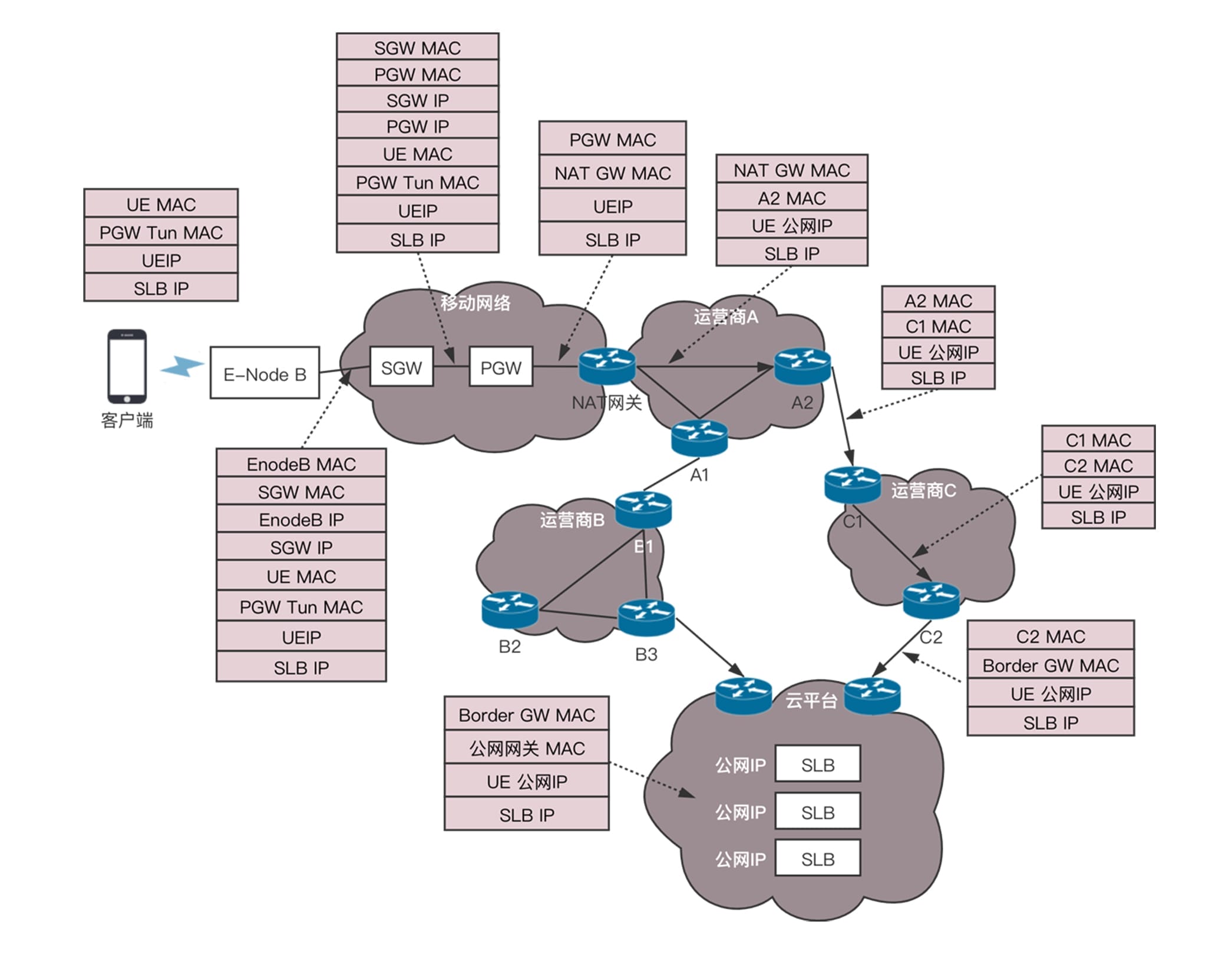 到达A2之后,从路由表中找到下一跳是路由器C1,于是将目标MAC换成C1的MAC地址。到达C1之后,找到下一跳是C2,将目标MAC地址设置为C2的MAC。到达C2后,找到下一跳是云平台的边界路由器,于是将目标MAC设置为边界路由器的MAC地址。