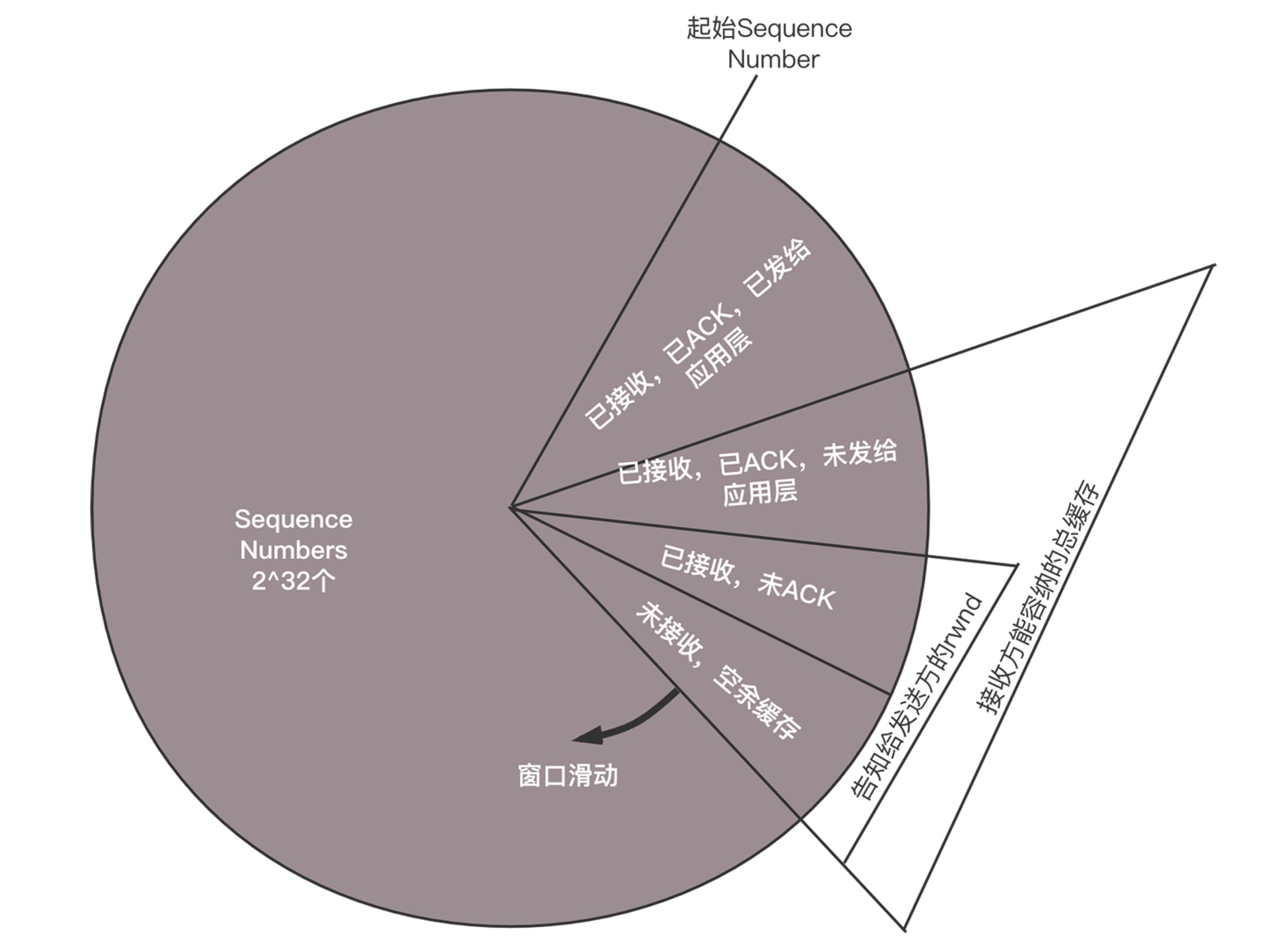 整个TCP的发送,一开始会协商一个Sequence Number,从这个Sequence Number开始,每个包都有编号。滑动窗口将接收方的网络包分成四个部分: