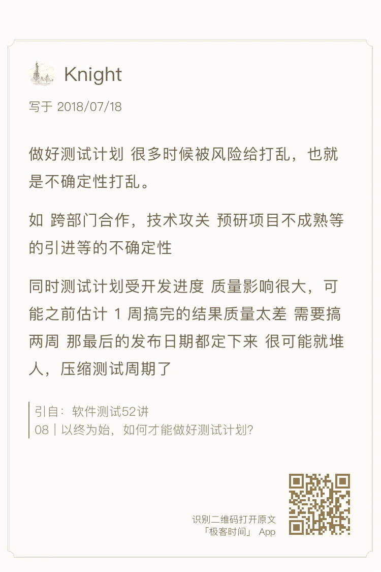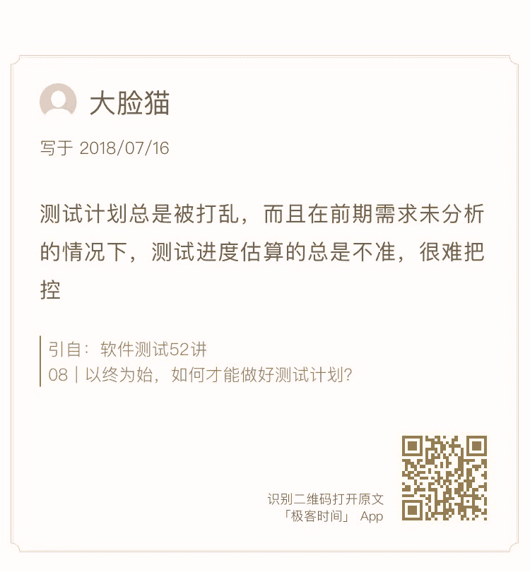 在第8篇文章《以终为始,如何才能做好测试计划?》中,我和你分享了虽然在敏捷开发模式下,软件测试不再局限于厚重的、正式的计划文档,但是测试计划的重要性丝毫没有发生变化。一份成功的测试计划,依旧必须要清楚地描述出测试范围、测试策略、测试资源、测试进度和测试风险预估这五个最重要的方面。