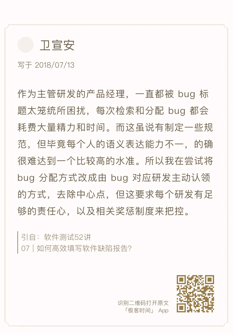 另外,我发现读者在文章的留言中也提出了很多建设性的方法。比如,下面这位昵称为“卫宣安”的读者,提出了让开发人员主动来认领缺陷的方式。如果说所有的开发人员都具有很强的责任心,同时系统规模也不是太大,或者说报告的缺陷数量不是很多的情况下,这的确是解决问题的一个好思路。但是,当团队规模比较大,缺陷数量也比较多的时候,要求每个开发人员都去挨个查看所有缺陷的效率就会很低。