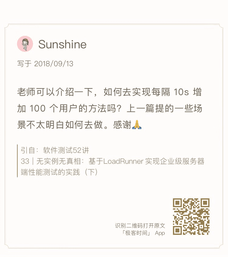在这篇文章最后,我希望你能够分享一下你在实际开展性能测试时,都遇到过哪些问题,又是如何解决的。虽然这篇文章的留言比较少,但也能从中看出大家在开展性能测试的时候,确实也如我当初一样,遇到了各种各样的问题。