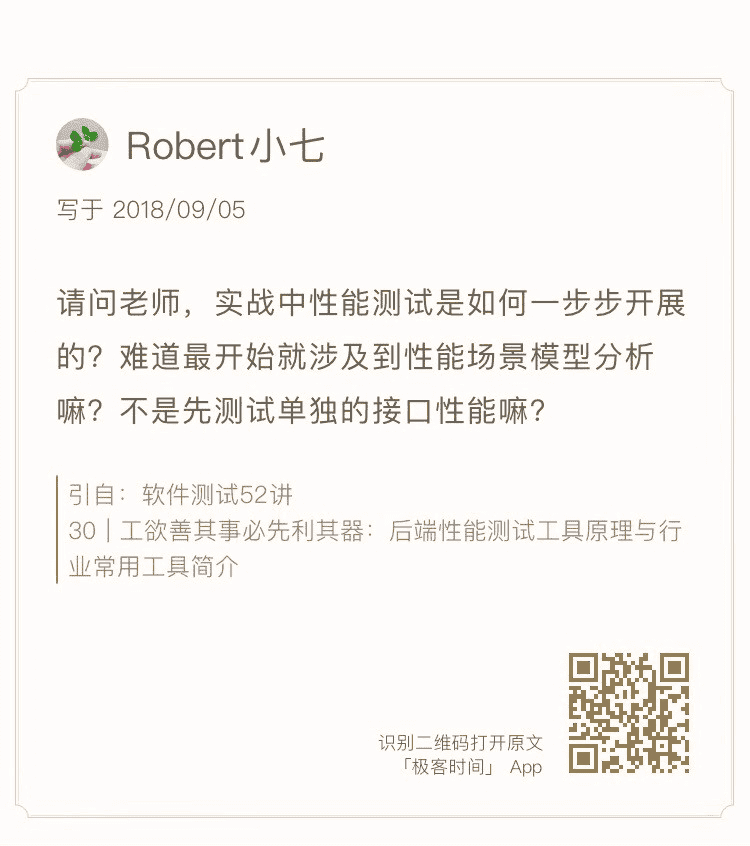 因为我后面增加了一篇JMeter的加餐文章,所以这里我也就不再过多地介绍后端性能测试工具了。这次,我来回答一下“Robert小七”提到的问题。