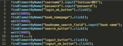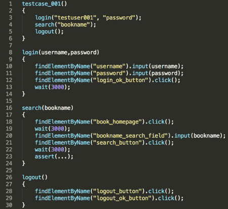 早期的GUI自动化测试脚本,无论是用开源的Selenium开发,还是用商用的QTP(Quick Test Professional,现在已经改名为Unified Functional Testing)开发,脚本通常是由一系列的页面控件的顺序操作组成的,如图2所示的伪代码展示了一个典型的早期GUI测试脚本的结构。