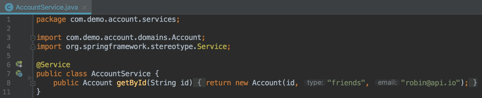 图2中,代码的第8行实现了accountService.getById()方法,具体逻辑就是返回一个以传入ID为ID的Account对象。