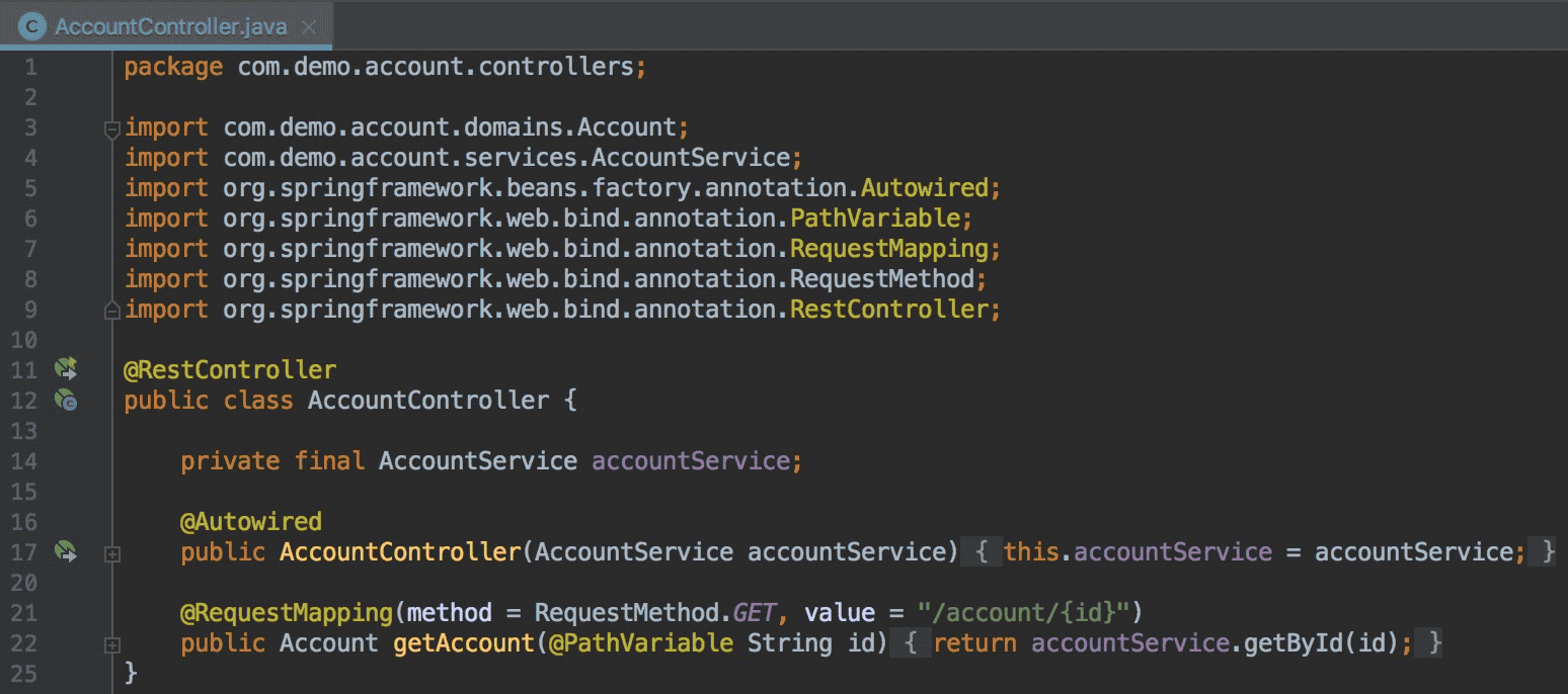 图1中,代码的第21行说明了API的endpoint以及对应的操作是GET方法,第22行明确说明了GET方法具体的业务逻辑是由accountService.getById()方法实现的。