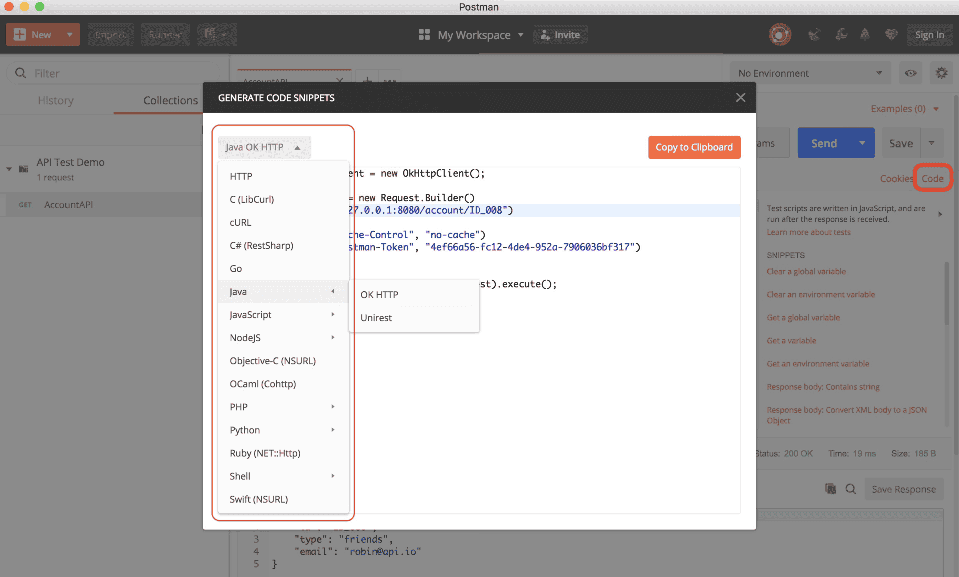 我建立了“API Test Demo”的Collection,并且将刚才的测试request命名为“AccountAPI”保存到这个Collection中。