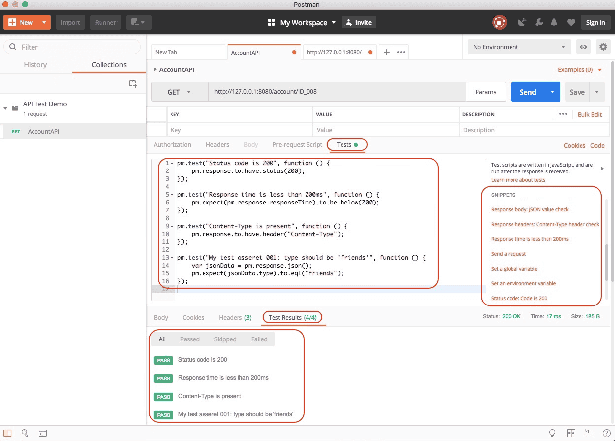 在Postman中添加结果验证也非常方便,假定我们在Account API测试过程中有以下四个验证点: