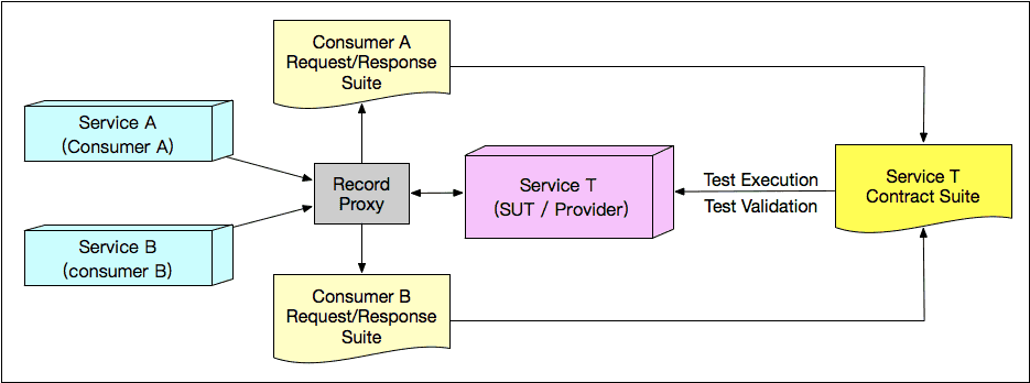 那么接下来,我们要解决的问题就是:如何才能找到Service A和Service B对Service T的所有可能调用了。其实这也很简单,在逻辑结构上,我们只要在Service T前放置一个代理,所有进出Service T的Request和Response都会经过这个代理,并被记录成JSON文件,也就构成了Service T的契约。