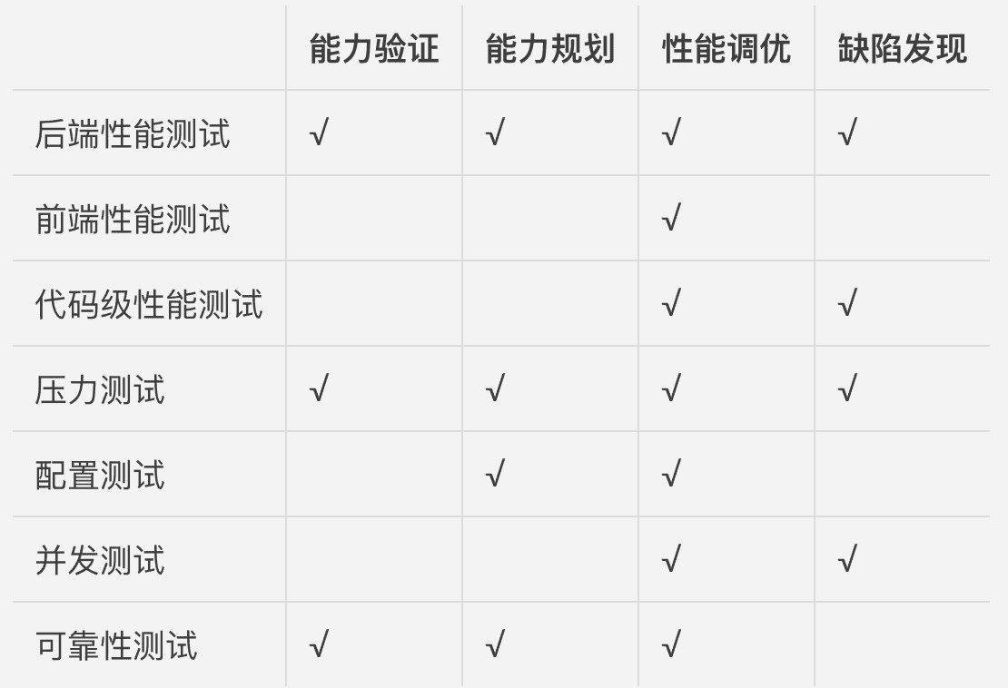 不同的性能测试方法适用于不同的应用领域去解决不同的问题,这里“不同的应用领域”主要包括能力验证、能力规划、性能调优、缺陷发现这四大方面。每个应用领域可以根据自身特点,选择合适的测试方法。