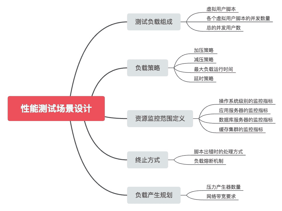 以上这些场景组合在一起,就构成了性能测试场景设计的主要内容。也就是说,性能测试场景会对测试负载组成、负载策略、资源监控范围定义、终止方式,以及负载产生规划作出定义,而其中的每一项还会包含更多的内容。具体请参见如图1所示的思维导图。