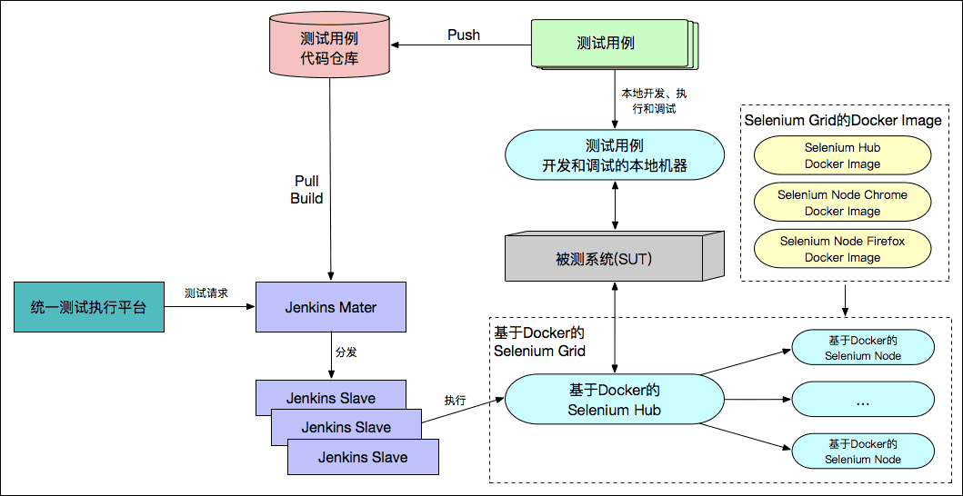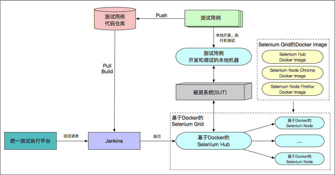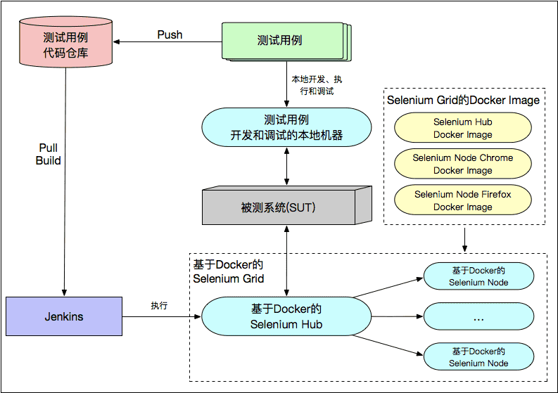 如图1所示,就是一个基于Docker实现的Selenium Grid的测试基础架构。