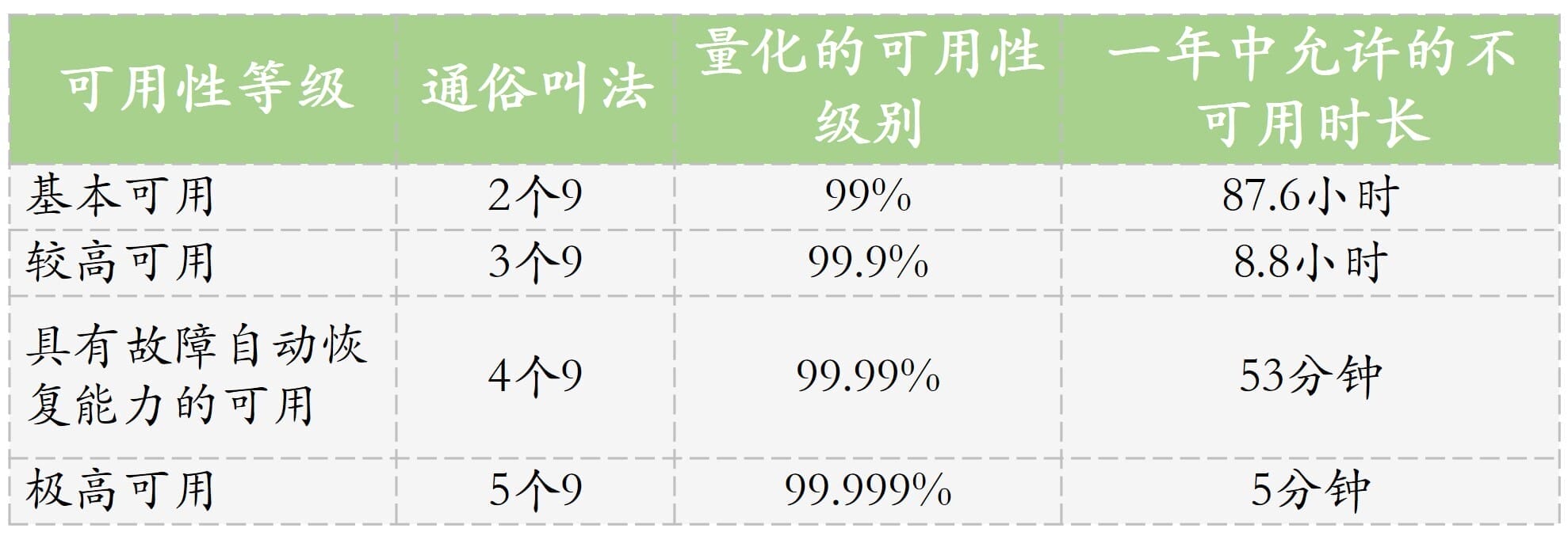 一般,我们以“年”为单位来统计网站的可用性等级。“9”的个数越多,一年中允许的不可用时间就越短,当达到5个“9”的时候,系统全年不可用时间只有区区5分钟,可想而知这个指标非常难达到。