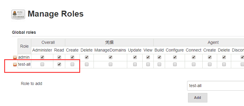 创建一个名称为test-all的全局角色,该角色的权限为Overall/read,对于Jenkins面板有读取权限。该角色的凭据栏和agent栏都没有勾选,表示对Jenkins系统管理的凭据,node节点等都没有权限。