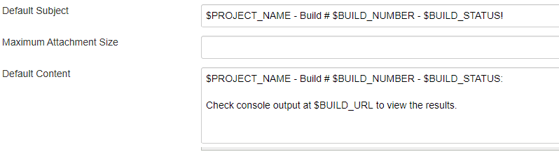 这两个参数的内容均使用了jenkins内置的全局变量,其中$PROJECT_NAME表示项目的名称,$BUILD_NUMBER表示项目构建的ID,$BUILD_STATUS表示项目构建状态。如果想要自定义邮件的主题和内容,直接在这里修改即可。
