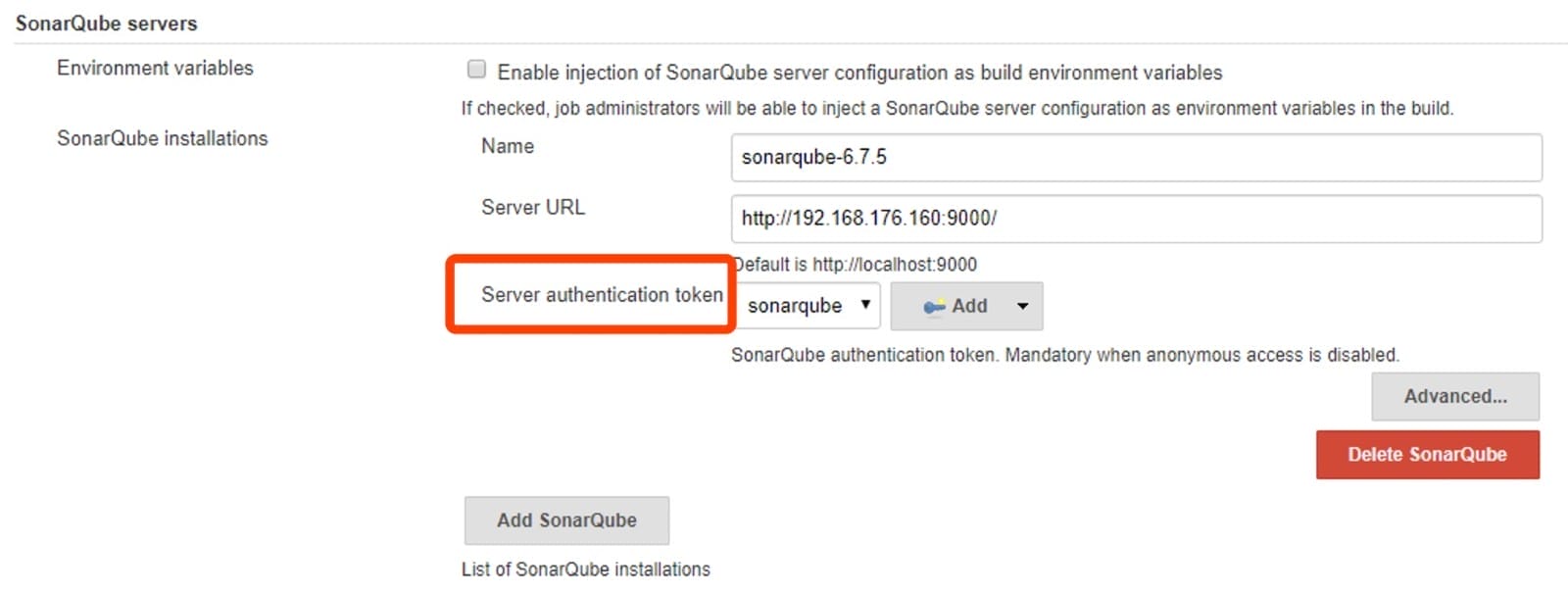 点击菜单”manage jenkins(管理jenkins)--> configure system (系统配置)“,找到”SonarQube servers“配置参数,配置与sonarqube的连接,如下所示