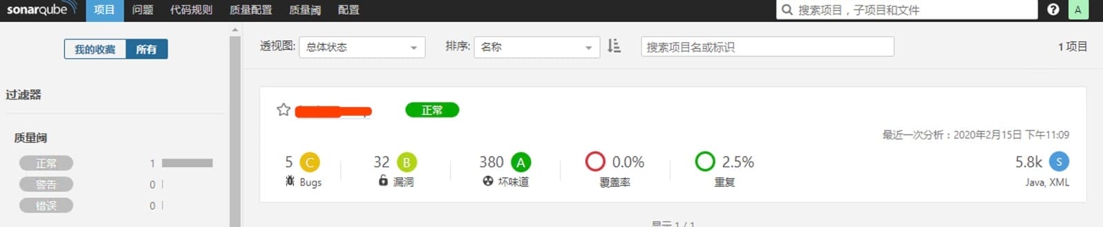 然后会在sonar web界面出现一个新的项目,如下-