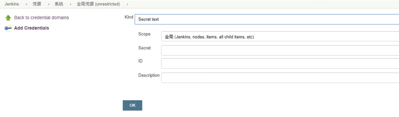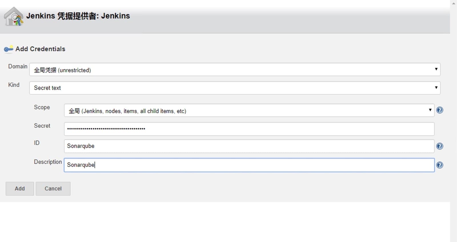 Secret text如下所示,添加完后点击Add即可添加,然后在上图红色框处的下拉框中选择此凭据即可。