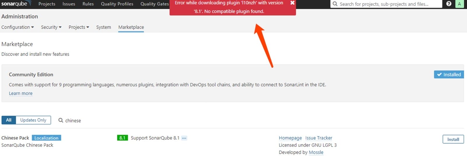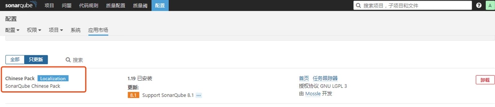 可能的原因是插件版本与sonar版本不兼容,可以去sonar官方github下载合适的汉化插件,比如我的版本是6.7.5,在github上发现sonar-l10n-zh-plugin-1.19该版本支持,下载放到宿主机/data/sonar/extensions/plugins 目录后,重启sonar容器即可。