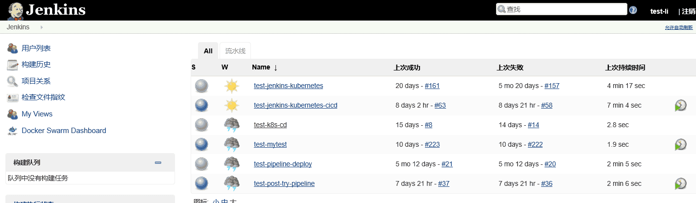然后就可以使用test-li用户登录了。需要注意的是该用户需要在Jenkins中存在。