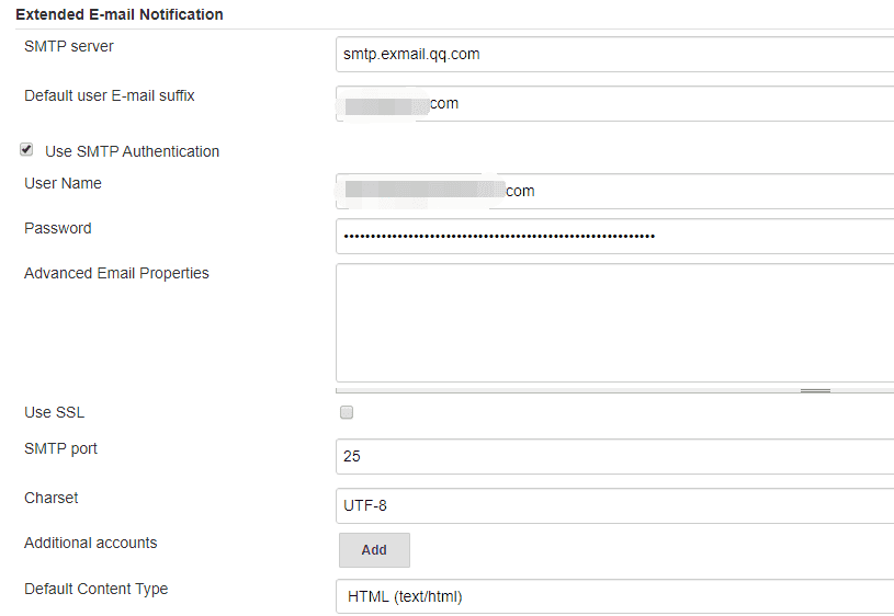 该插件下的”Default Subject“和”Default Content“参数分别用来设置发送邮件的主题和内容,默认的配置如下所示。