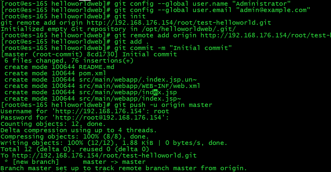 [root@es-165 helloworldweb]# git remote add origin http://192.168.176.154/root/test-helloworld.git