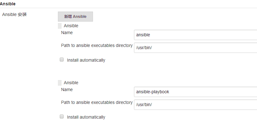ansible测试没问题以后,我们就可以在jenkins中配置ansible的环境变量了。- 点击 “Manage Jenkins”—> “Global Tool Configuration(全局工具配置)“,在跳转的界面中找到Ansible 参数项,点击新增ansible,配置ansible命令的环境变量,如下所示