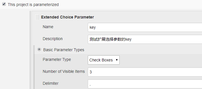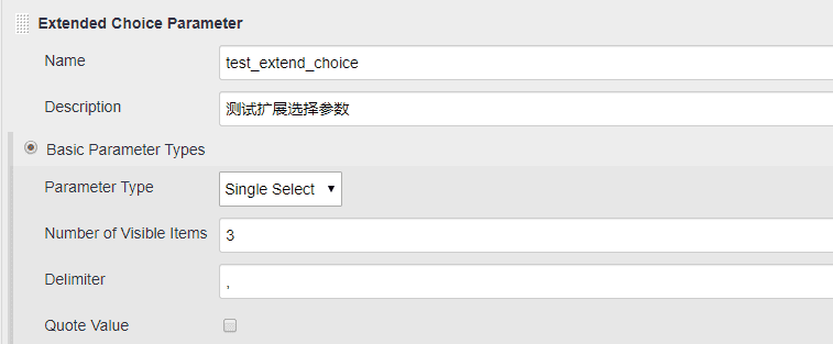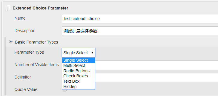 顾名思义,可扩展的选择参数,相比于choice Parameter只能使用单个参数选项外,该参数可以同时定义多个参数选项,并为每个参数选项设置不同的值,该参数使用插件为Extended Choice Parameter Plug-In。
