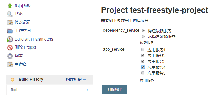 定义一个依赖服务参数,参数选择类型为单选,定义两个参数值,build和not_build,对应的描述分别为”构建依赖服务”和”不构建依赖服务”。