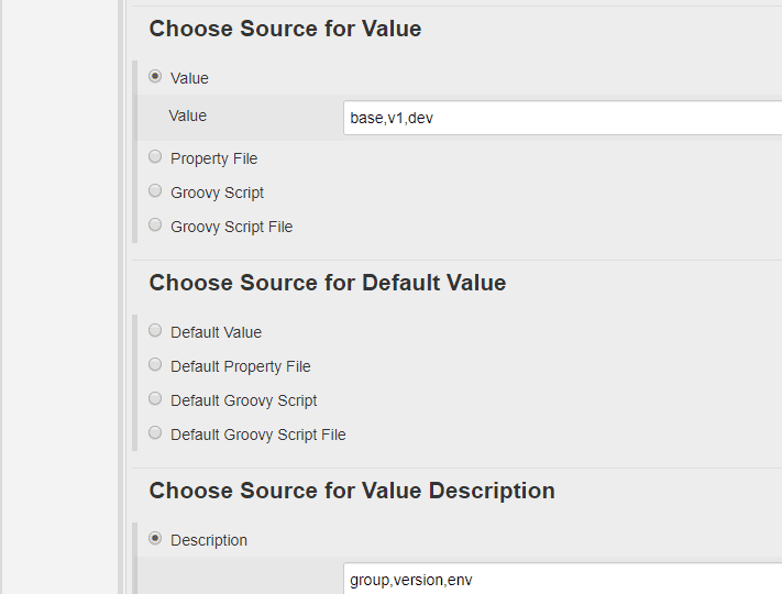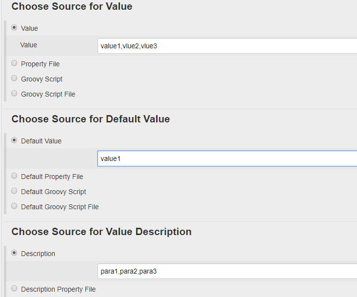 Choose Source for Value:该参数得值,必须项。- Choose Source for default Value:该参数的默认值,非必须。- Choose Source for Value Description:关于该参数值的描述,非必须;如果没有设置该选项,在执行job的时候,在参数后面的下拉列表中会直接显示该参数的值;如果设置了才参数,在执行job的时候,在参数后面的下拉列表中会直接显示该参数的值的描述,也就是此参数设置的值,需要注意的是,如果设置了此参数,此参数的值数量,要与设置的value的值的数量相同,如果数量不相同,最后的一个值会使用设定的Value的值填充,效果可以看下面。