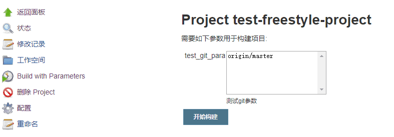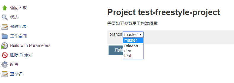 如下所示,点击”Build with Parameter”后会自动列出设定的源码仓库的git标记(列出的标记根据设定的git标记类型会有所不同,此示例使用的git标记为分支)。