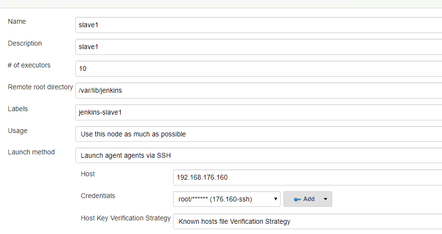 Launch metheod:用于配置jenkins slave节点的启动方式,主要分为ssh和jnlp两种,其中ssh为master主动连接slave节点,jnlp为slave节点主动连接agent,图上的配置使用的ssh方式。