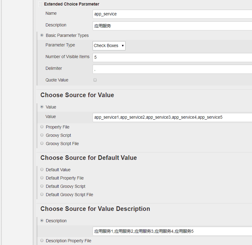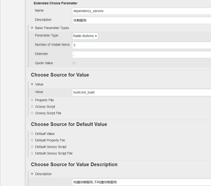 首先,如果多个项目依赖一个公共服务的情况,第一个Extend choice Parameter参数可以使用单选框类型,为了美观以及更清楚地列出公共服务列表,我使用Radio Buttons类型的参数,如下所示: