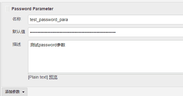 密码类型的参数:如果在配置Jenkins任务的时候不想在job中或者console log中显示明文密码,可以使用该参数,如下所示,可以给该参数设置一个默认值。