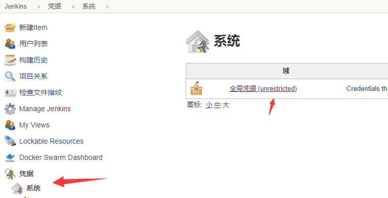 在jenkins主面板中点击”凭据(cridential)”—>”系统(system)”—>”全局凭据(Global credentials)(unrestricted)“,如下所示:
