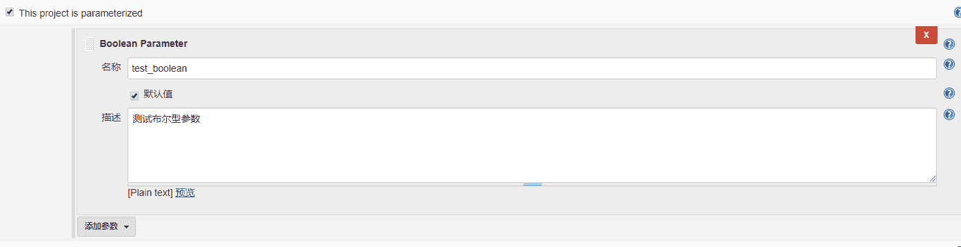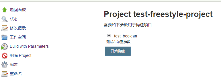 示例如下,勾选This project is parameterized,从”添加参数“下拉列表中点击”Boolean Parameter“