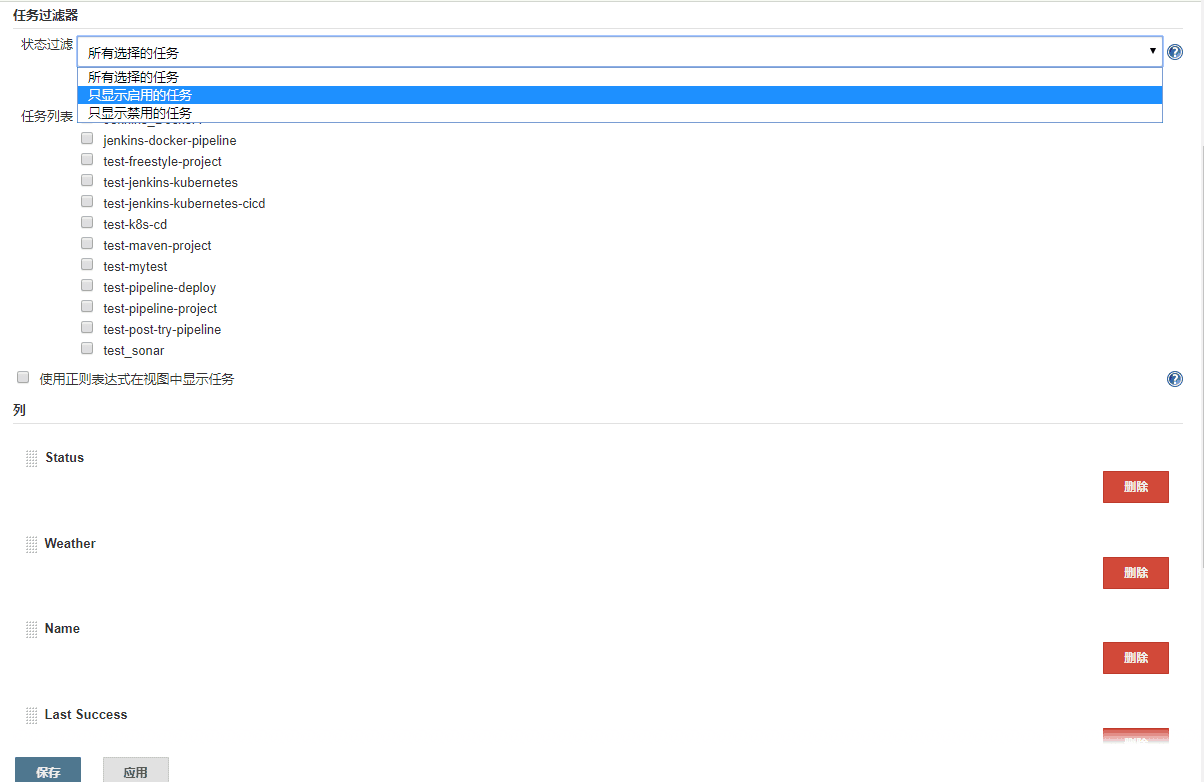 List view选项比较简单,用于从全局job列表中自定义选择要放到该视图下的Job,选择Job时可以通过条件过滤或者正则表达式匹配想要放到该视图下的Job;同时对于该视图中的显示Job信息的列的字段名称进行自定义添加或者删除,如下所示