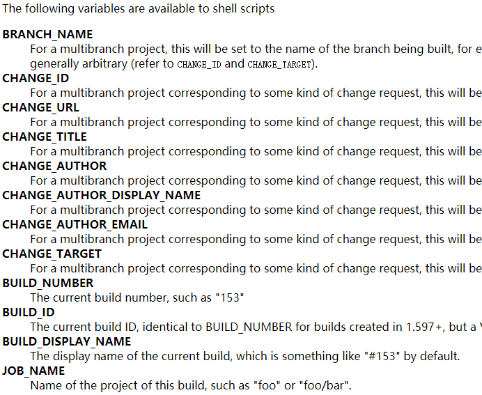 在Jenkins job中除了可以使用上面自定义的变量外,还可以使用Jenkins中内置的环境变量,内置的环境变量可以在job的任何配置步骤中使用,可以通过http://Jenkins_URL/env-vars.html/获取所有的内置变量。如下所示: