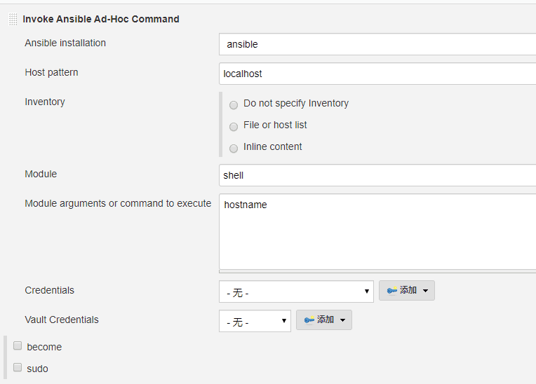 在”构建“步骤中,点击”Invoke Anisble Ad-hoc command“,配置如下: