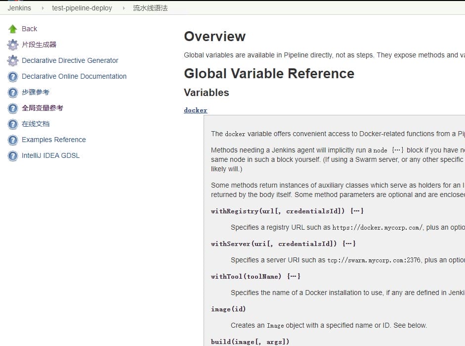 docker-pipeline插件在安装后,会产生一系列的变量,要获取这些变量的使用方法的详细信息,可以在任何一个pipeline类型的job里,通过pipeline syntax(流水线语法)来查看,在跳转的界面中点击”全局变量参考菜单“
