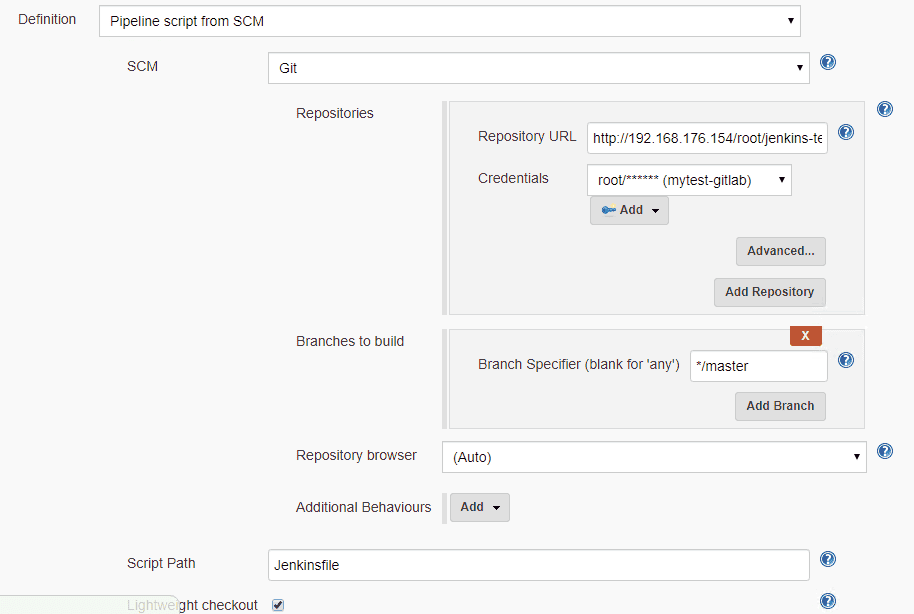 将上面的Dockerfile和Jenkinsfile文件一起放到源码仓库中,然后配置jenkins项目时使用Pipeline script from SCM方式,配置该源码仓库的地址即可-