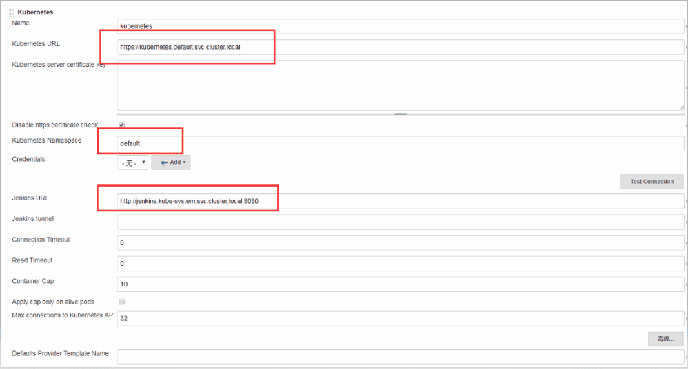 部署在kubernetes集群内的jenkins配置连接kubernetes相对较简单,同样在系统配置页进行配置,不用生成上面的一系列证书,kubernetes的地址直接写kubernetes的FQDN即可。