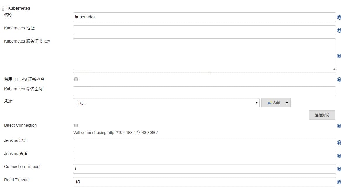 名称:这里用于填写要添加的这个云(cloud)的名称,默认为”kubernetes”,如果不想用这个可以自定义。在编写pipeline的时候会用到。