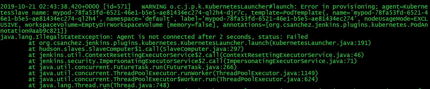 如果不开启代理端口,Jenkins通过kubernetes动态生成slave节点的时候,jenkins后台会报如下错误,并且pod会不断的生成和删除。