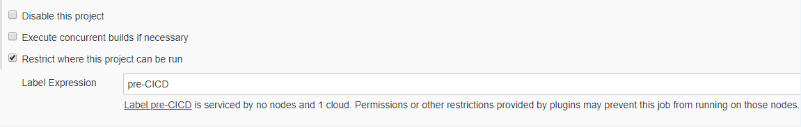 同时,在使用其他类型(比如 自由风格类型、maven类型)的job时也能够使用该PodTemplate方法,用于动态生成slave。比如创建一个自由风格类型的job,配置job时勾选 Restrict where this project can be run ,在显示的Label Expression 输入框里输入我们上边配置PodTemplate时设定的标签(Labels) 名称 pre-CICD即可。