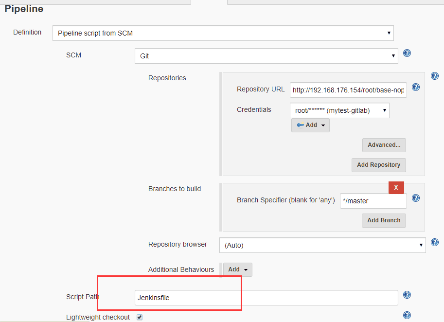 checkout([$class: 'GitSCM', branches: [[name: '*/master']], doGenerateSubmoduleConfigurations: false, userRemoteConfigs: [[credentialsId: 'c33d60bd-67c6-4182-b52c-d7aeebfab772', url: 'http://192.168.176.154/root/base-nop.git']]])