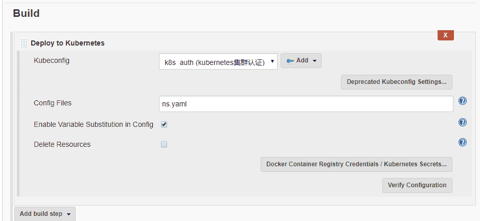 在普通类型(比如自由风格类型、maven类型)的Job中,配置Job时使用”Add build step(添加构建步骤)”选项,从列出的选项列表中选择”Deploy to kubernetes“。